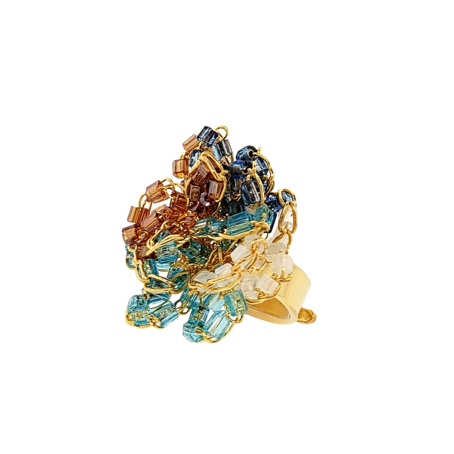 Anel tecido com a técnica do crochê por artesãs brasileiras altamente qualificadas. Confeccionado com fio de cobre banhado em ouro 18 quilates. É uma joia leve e confortável. Fabricado com materiais hipoalergênicos e sem níquel. Esse brinco é tecido individualmente e carrega a impressão digital da artesã que o teceu, tornando sua joia única e deslumbrantes que durarão por toda a vida.