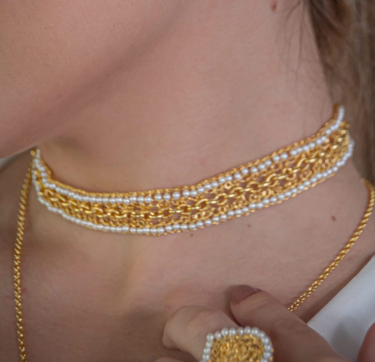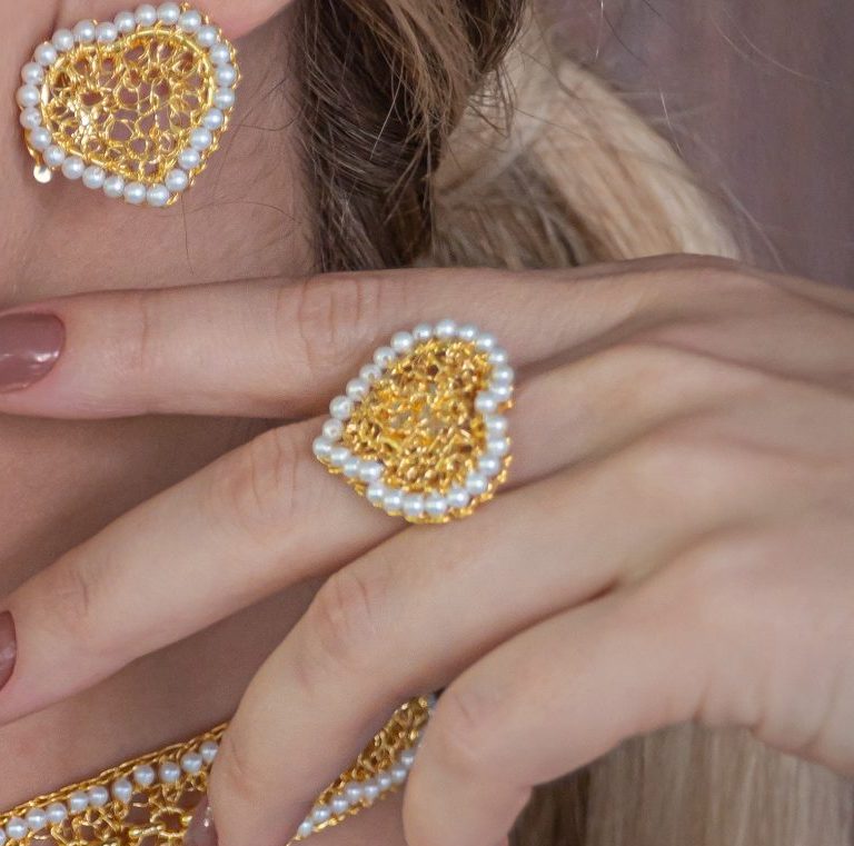 Anel tecido com a técnica do crochê por artesãs brasileiras altamente qualificadas. Confeccionado com fio de cobre esmaltado. É uma joia leve e confortável. Fabricado com materiais hipoalergênicos e sem níquel. Esse anel é tecido individualmente e carrega a impressão digital da artesã que o teceu, tornando sua joia única e deslumbrantes que durarão por toda a vida. Colar de Crochê Correntes do Amor Entrelaçados Pérola possui: