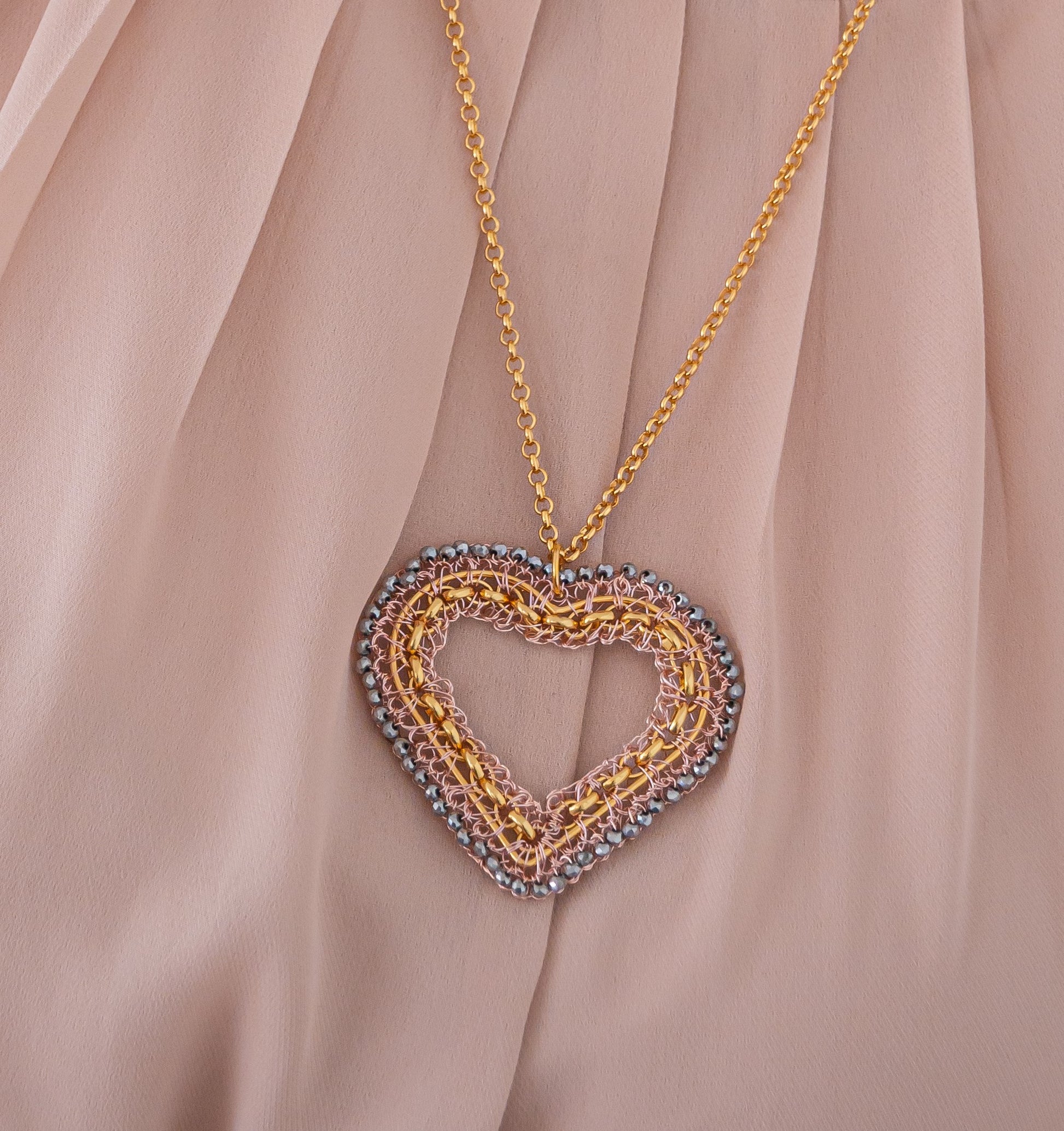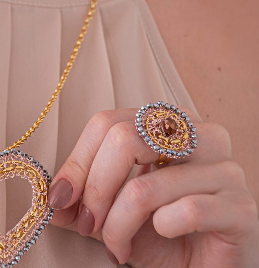 Anel tecido com a técnica do crochê por artesãs brasileiras altamente qualificadas. Confeccionado com fio de cobre esmaltado. É uma joia leve e confortável. Fabricado com materiais hipoalergênicos e sem níquel. Esse anel é tecido individualmente e carrega a impressão digital da artesã que o teceu, tornando sua joia única e deslumbrantes que durarão por toda a vida. Colar de Crochê Coração Correntes do Amor Entrelaçados Trio Gold possui: