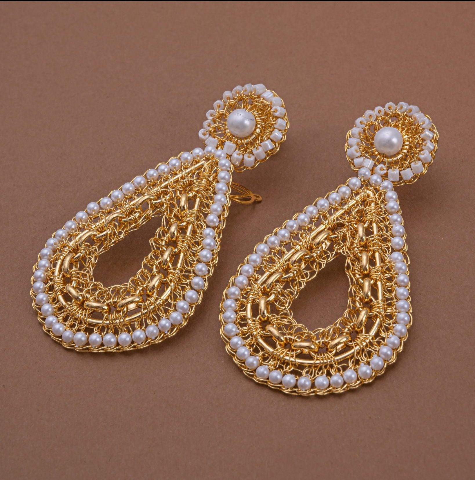 Brinco de Crochê Gota Correntes do Amor Entrelaçados Pérola