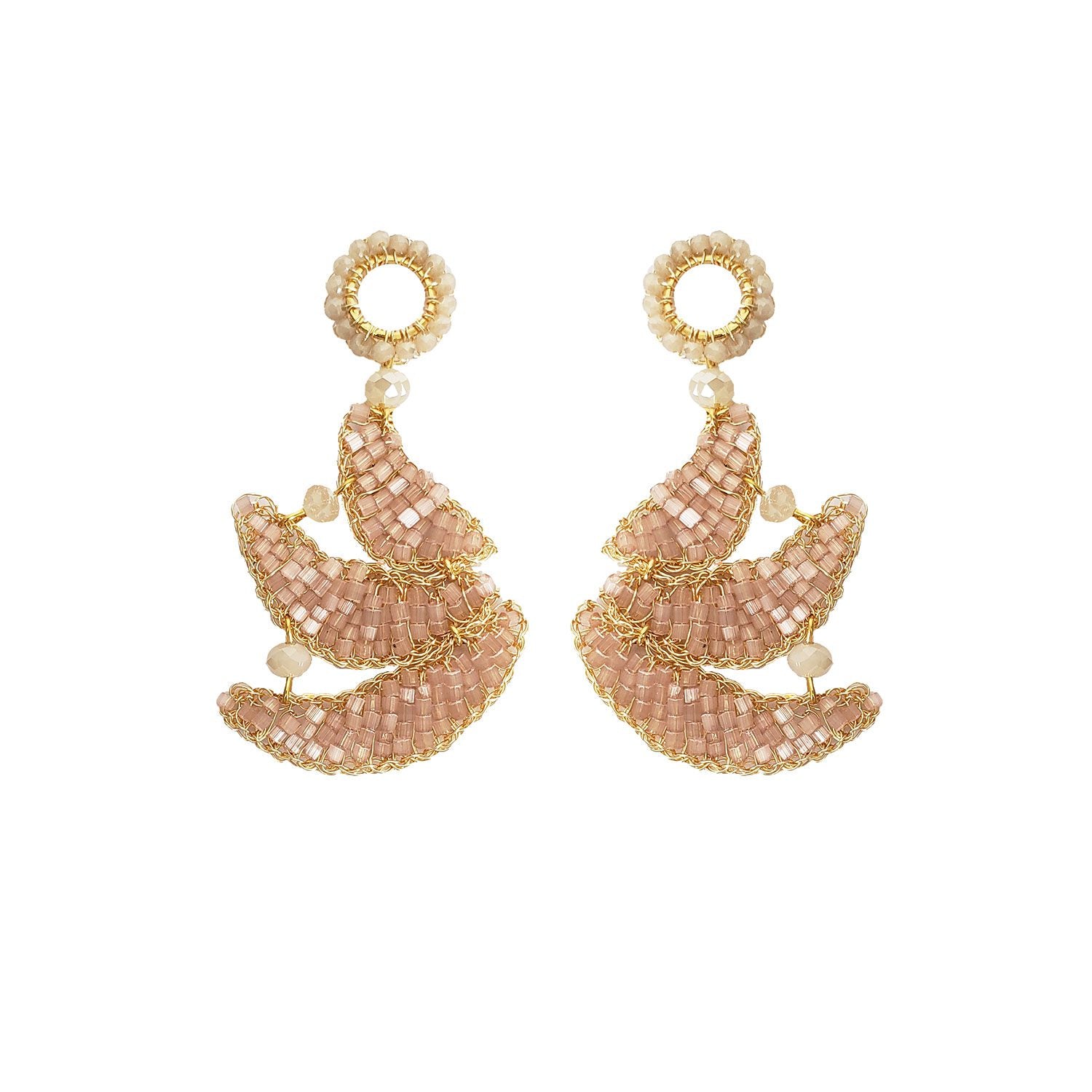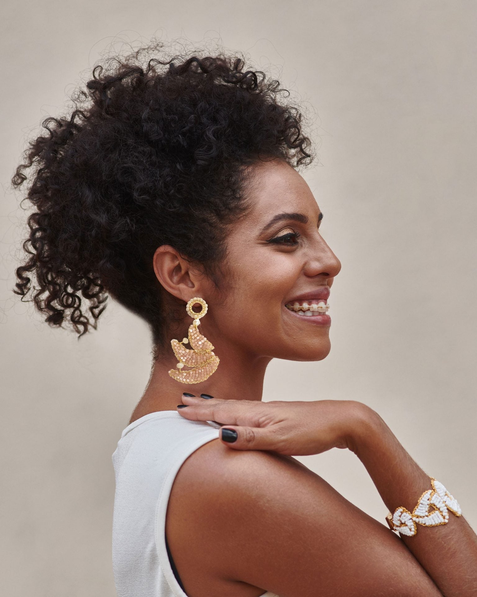 Brincos tecidos com a técnica do crochê por artesãs brasileiras. Banhado em ouro 18 quilates, e confeccionado com vidrilhos brancos. Seu modelo é sofisticado. Além de ser uma peça leve e confortável, podendo usa-lá em diversas ocasiões. Todos os seus materiais são antialérgicos e sem níquel. Cada peça é tecida individualmente e carrega a impressão digital da artesã que a teceu, tornando sua joia única. Esse trabalho primoroso transforma seu brinco em uma obra de arte 100% feita à mão, levando horas até sua finalização.