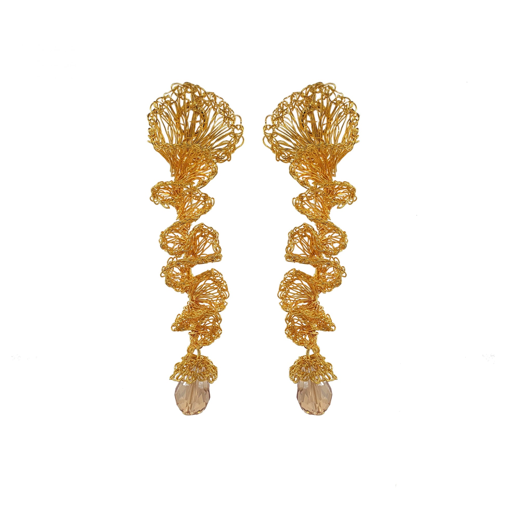Brincos tecidos com a técnica do crochê por artesãs brasileiras altamente qualificadas. Confeccionado com fio de cobre banhado em Ouro 18k. É uma joia leve e confortável. Fabricado com materiais hipoalergênicos e sem níquel. Esse brinco é tecido individualmente e carrega a impressão digital da artesã que o teceu, tornando sua joia única e deslumbrantes que durarão por toda a vida.