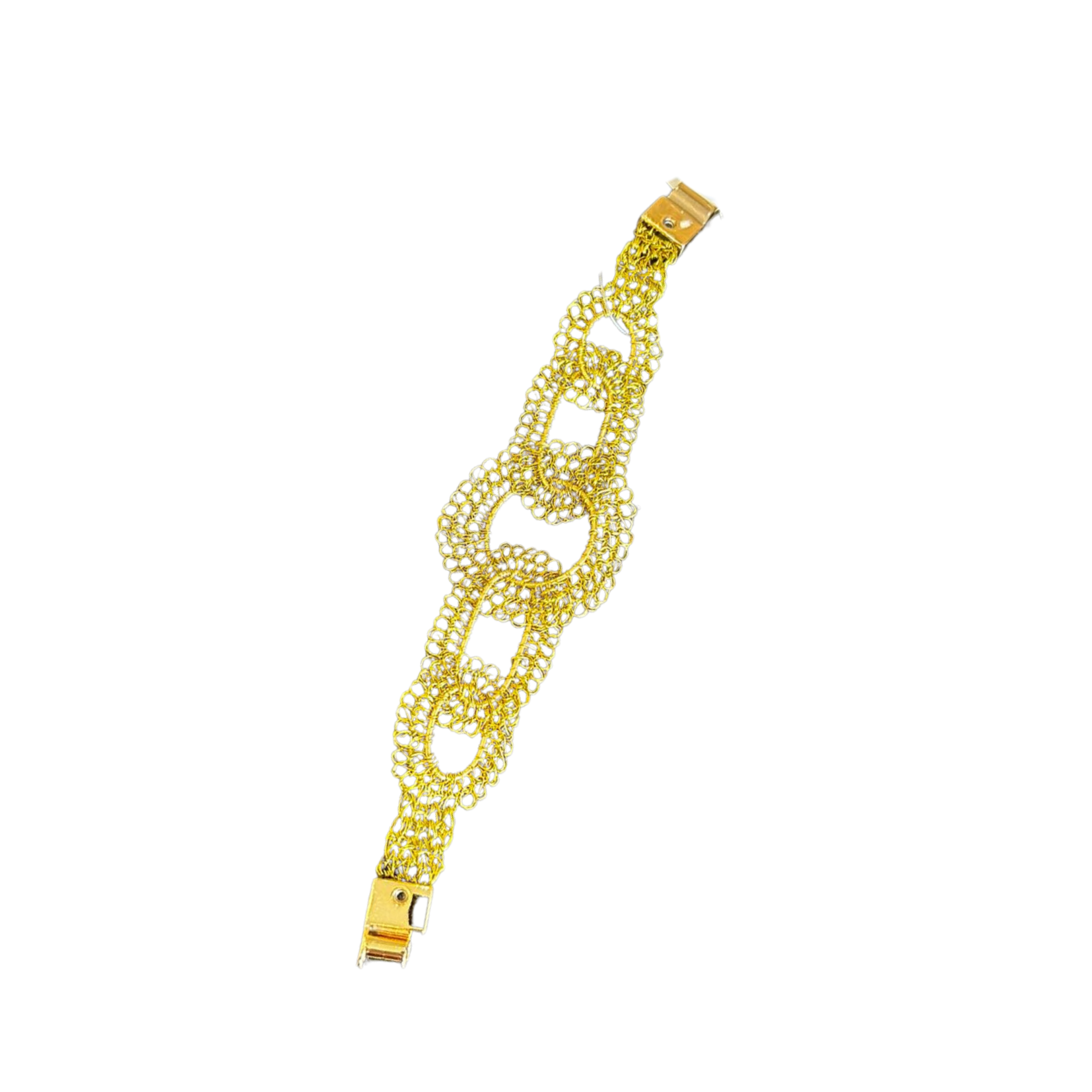 Bracelete tecido com a técnica do crochê por artesãs brasileiras altamente qualificadas. Confeccionado com fio de cobre banhado em ouro 18 quilates. É uma joia leve e confortável. Fabricado com materiais hipoalergênicos e sem níquel. Esse brinco é tecido individualmente e carrega a impressão digital da artesã que o teceu, tornando sua joia única e deslumbrantes que durarão por toda a vida.