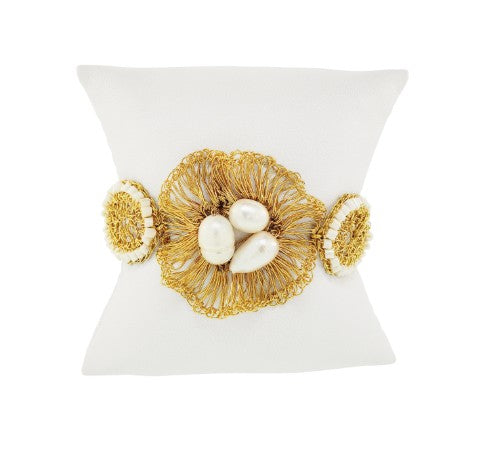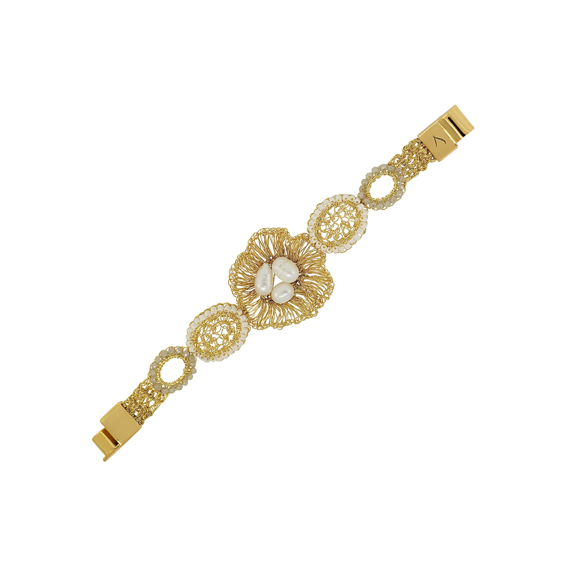 Bracelete tecido com a técnica do crochê por artesãs brasileiras altamente qualificadas. Confeccionado com fio de cobre banhado em ouro 18 quilates. É uma joia leve e confortável. Fabricado com materiais hipoalergênicos e sem níquel. Esse brinco é tecido individualmente e carrega a impressão digital da artesã que o teceu, tornando sua joia única e deslumbrantes que durarão por toda a vida.